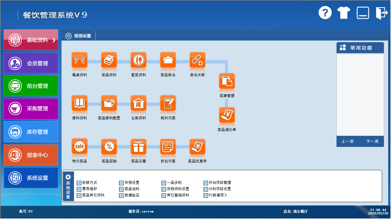 菜品资料:建立和维护菜品资料,设置菜品的基本参数,如套菜、时价菜、称重菜品等